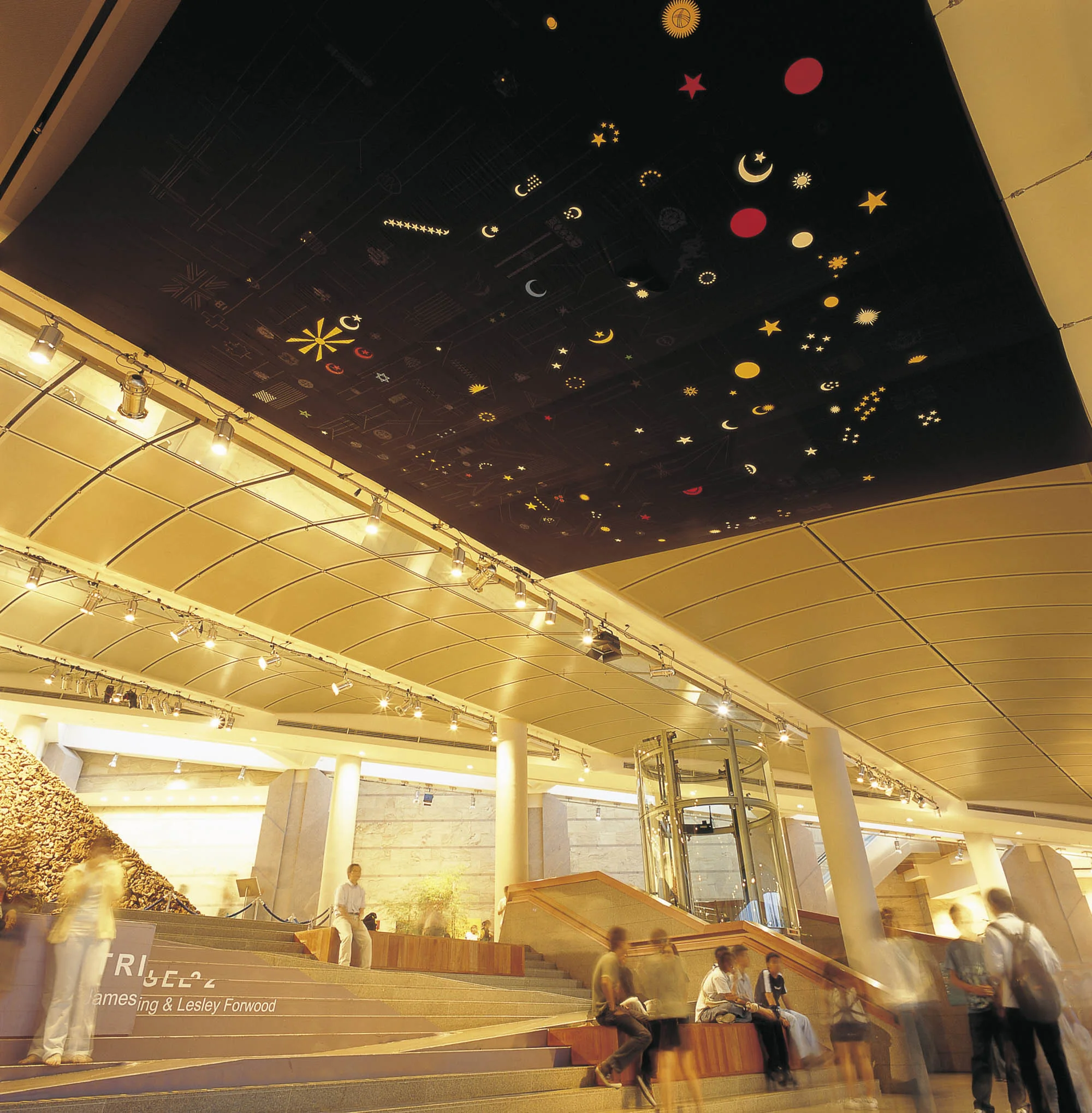 This piece, entitled Sunny Days and Starry Nights, consists of flags from every country in the world - which existed at the time of creating the work in 2005 - sewn together geographically. The celestial symbols of the flags remain highlighted in the foreground while the other designs within the flags have been darkened to recede into the background. The result is an interplay of the symbols of our temporary bordered world set against the eternal boundless cosmos.